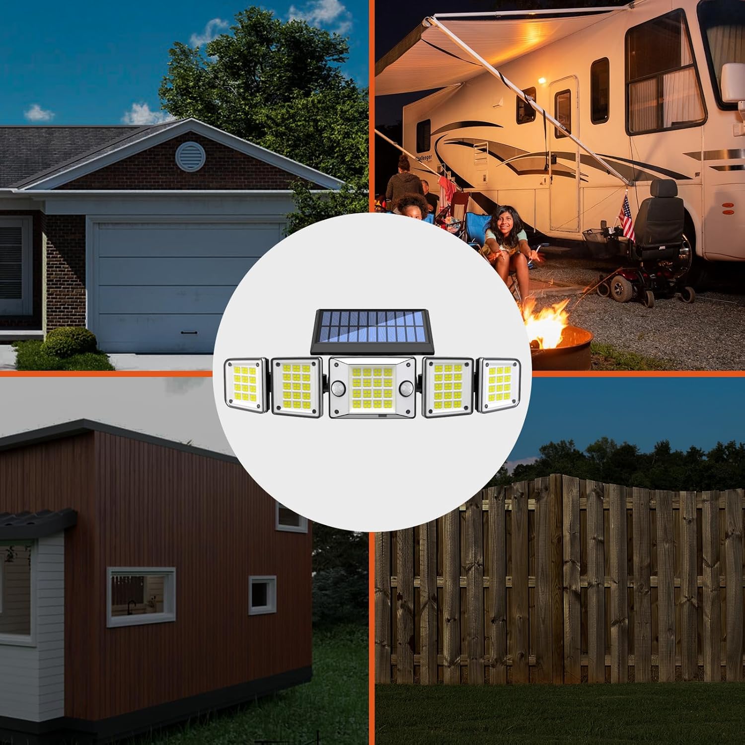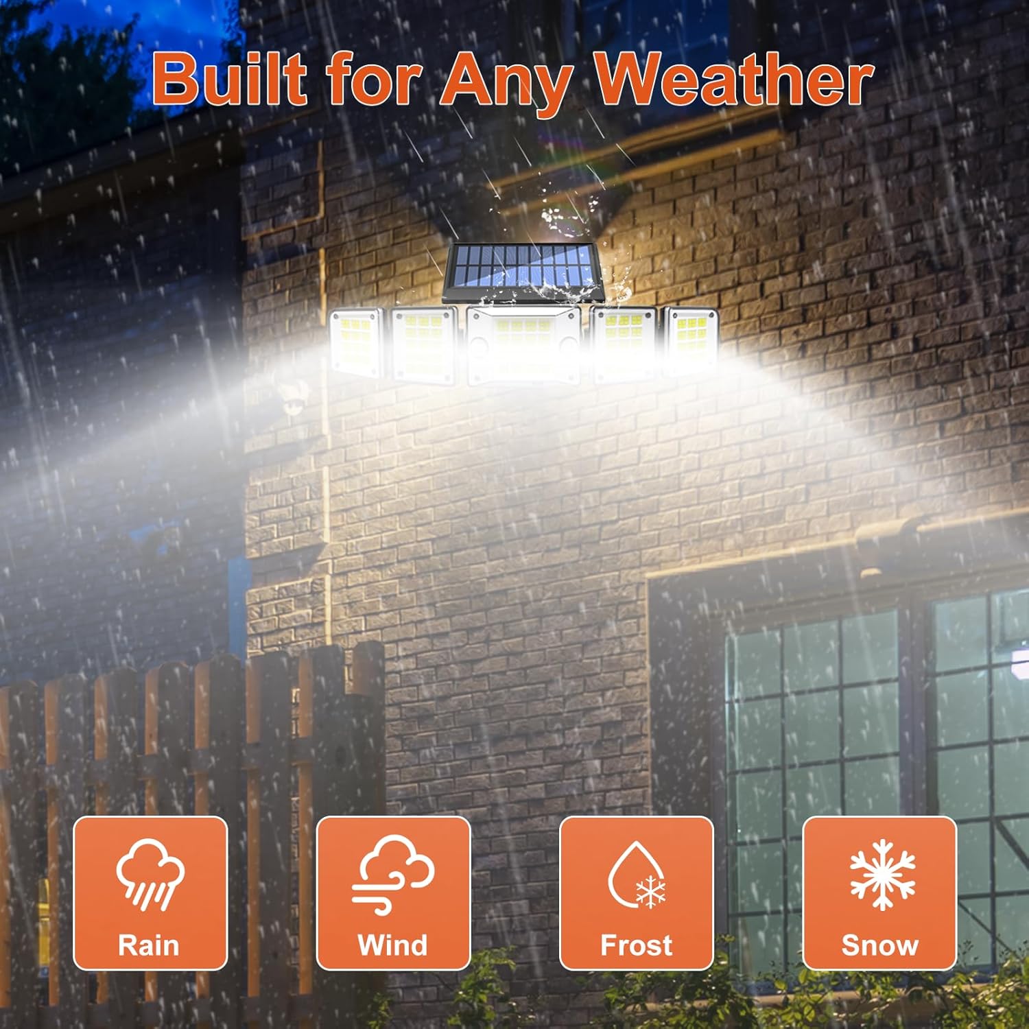 - [Innovative 5-Head Design]: The solar outdoor lights adopt 5-head structure with adjustable vertical and horizontal angles for each head, offering a 300°wide-angle lighting range. Perfect for your yard, garage, garden, pool, wall, and more