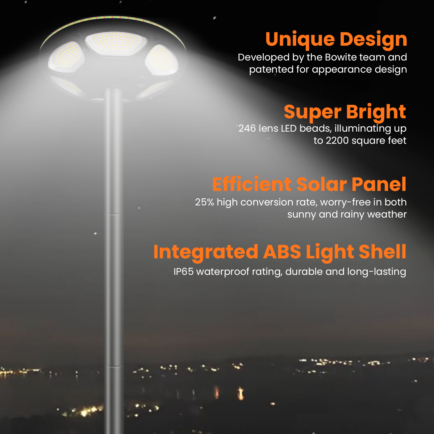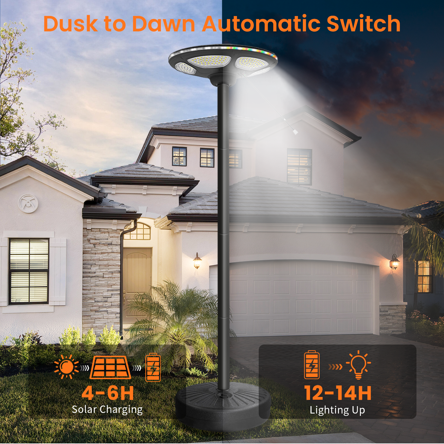 - 0 Electricity Bill — The solar street lights automatically turn on and off from dusk to dawn, fully powered by solar energy with no additional cost. The solar panel operates at 25% efficiency, charges in just 4-6 hours during the day, and provides 12-14 hours of continuous lighting on a full charge.
