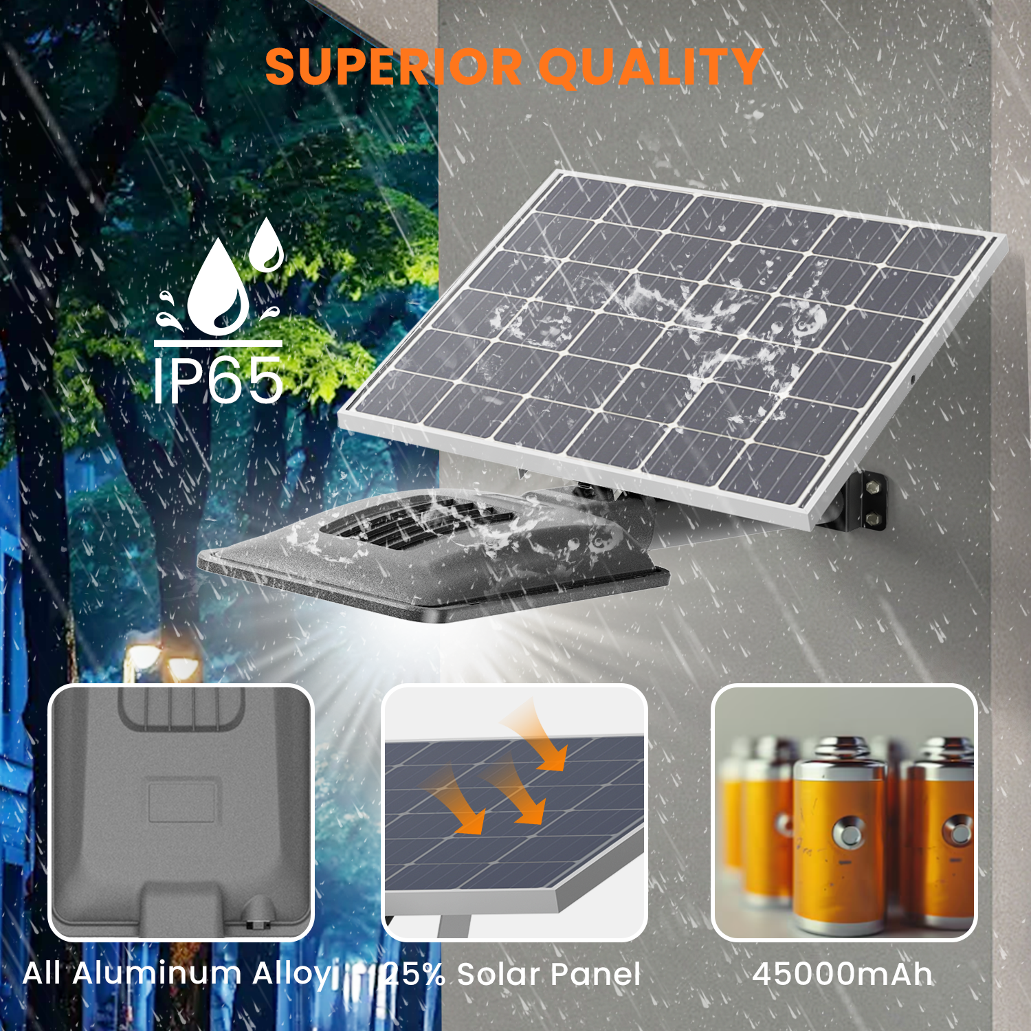 The split-type solar street light features a durable all-aluminum alloy housing, enhancing strength and long-lasting performance. It is designed for easy installation without wiring, with upgraded large LED beads providing bright and reliable illumination. Ideal for farms, warehouses, and parking lots.
